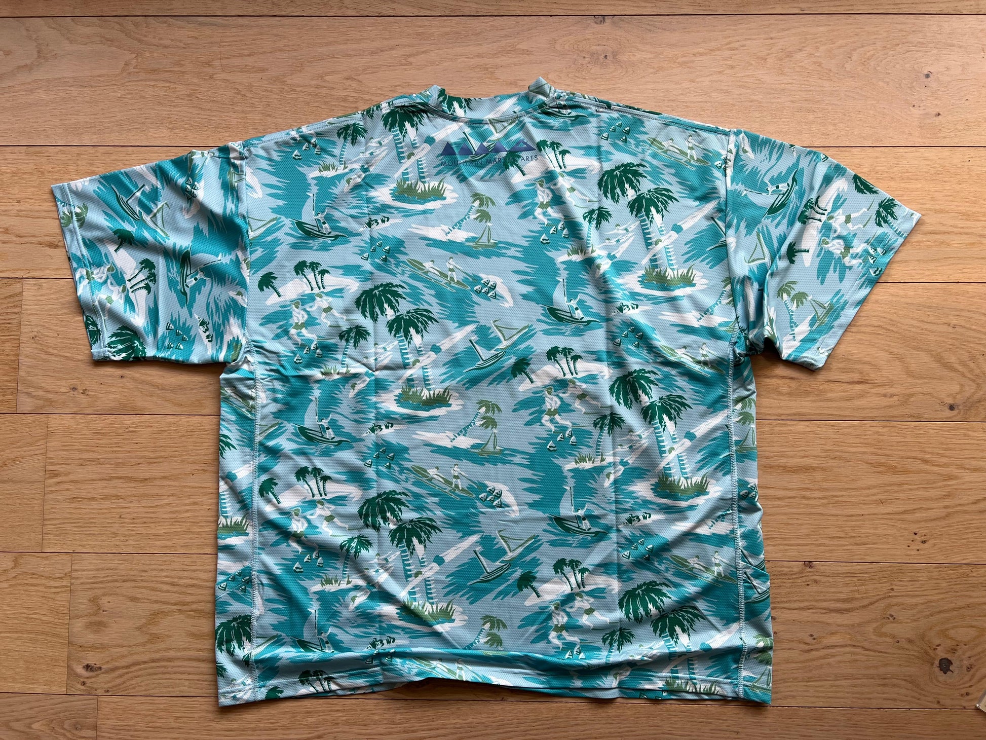 Le motif original, inspiré des chemises hawaïennes vintage, est imprimé intégralement par sublimation, sans altérer la fonctionnalité du vêtement.